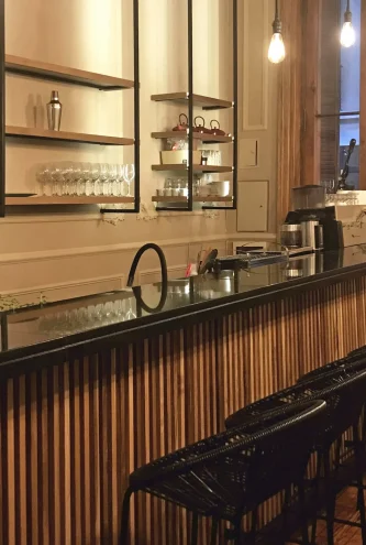 Este bar se encuentra en una zona emblemática de la ciudad. El objetivo de la reforma fue poner en valor los rasgos históricos de la edificación. Para esto diseñamos la barra con una palillería de madera y estanterías cuyo soporte remarca la gran altura y las molduras originales de la edificación.